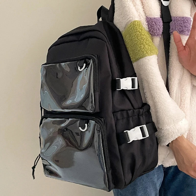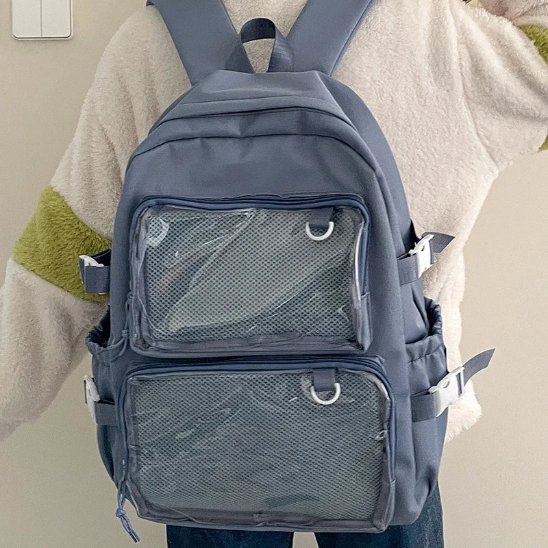 Display your favorite pins, badges, and collectibles with this Japanese-style transparent Ita bag. Perfect for anime fans, collectors, and anyone who loves to showcase their personality, this unique backpack features a clear window that turns your accessories into wearable art.
